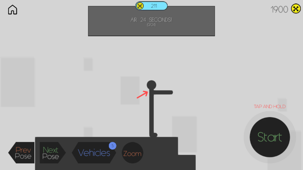 The pre-launch screen. Notice the goal banner ("AIR 24 SECONDS!"), the pose buttons, and the Vehicles button showing "5" available options.