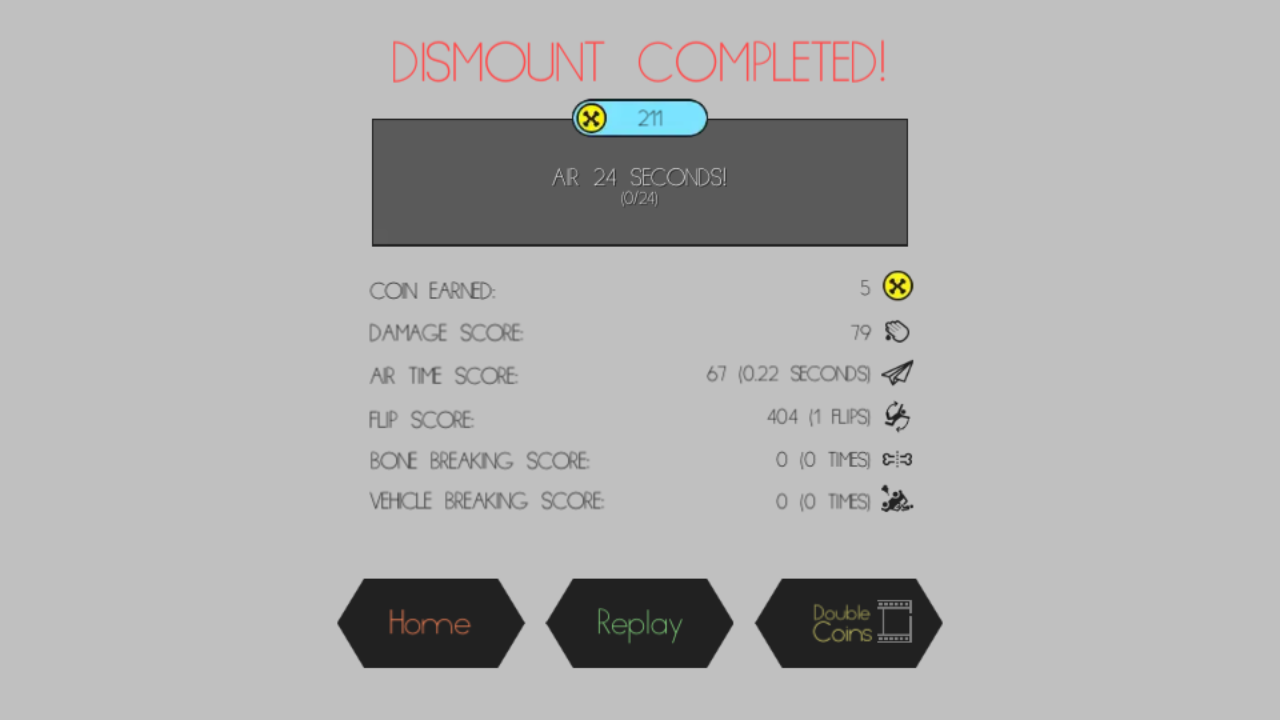My first result screen. 79 damage score, 67 air time score, 404 flip score (1 FLIP!), 0 bone breaking, 5 coins earned.